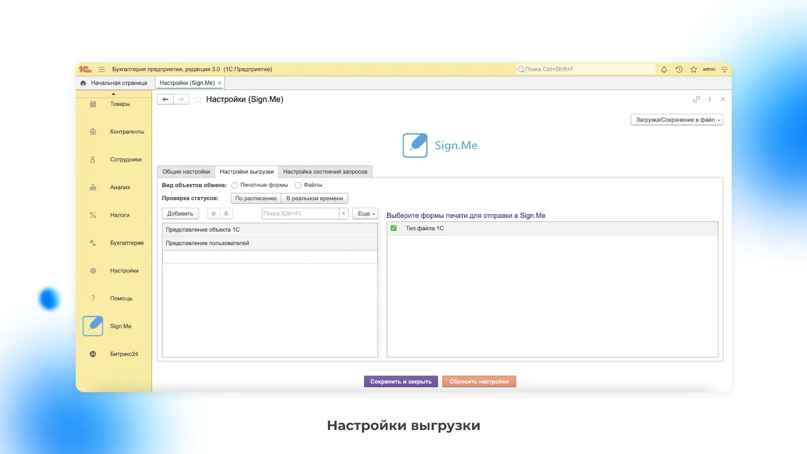 1С – это система автоматизации и управления бизнес-процессами. Функциональность 1С охватывает такие сферы, как бухгалтерский учёт, управление персоналом, работу с клиентами, документооборот и многое другое. В штатной версии 1С документы подписываются с помощью токенов, которые не всегда удобны для работы с физлицами. Для подписания документов с клиентами или сотрудниками есть интеграционный модуль от Sign.Me, который можно просто скачать и установить.