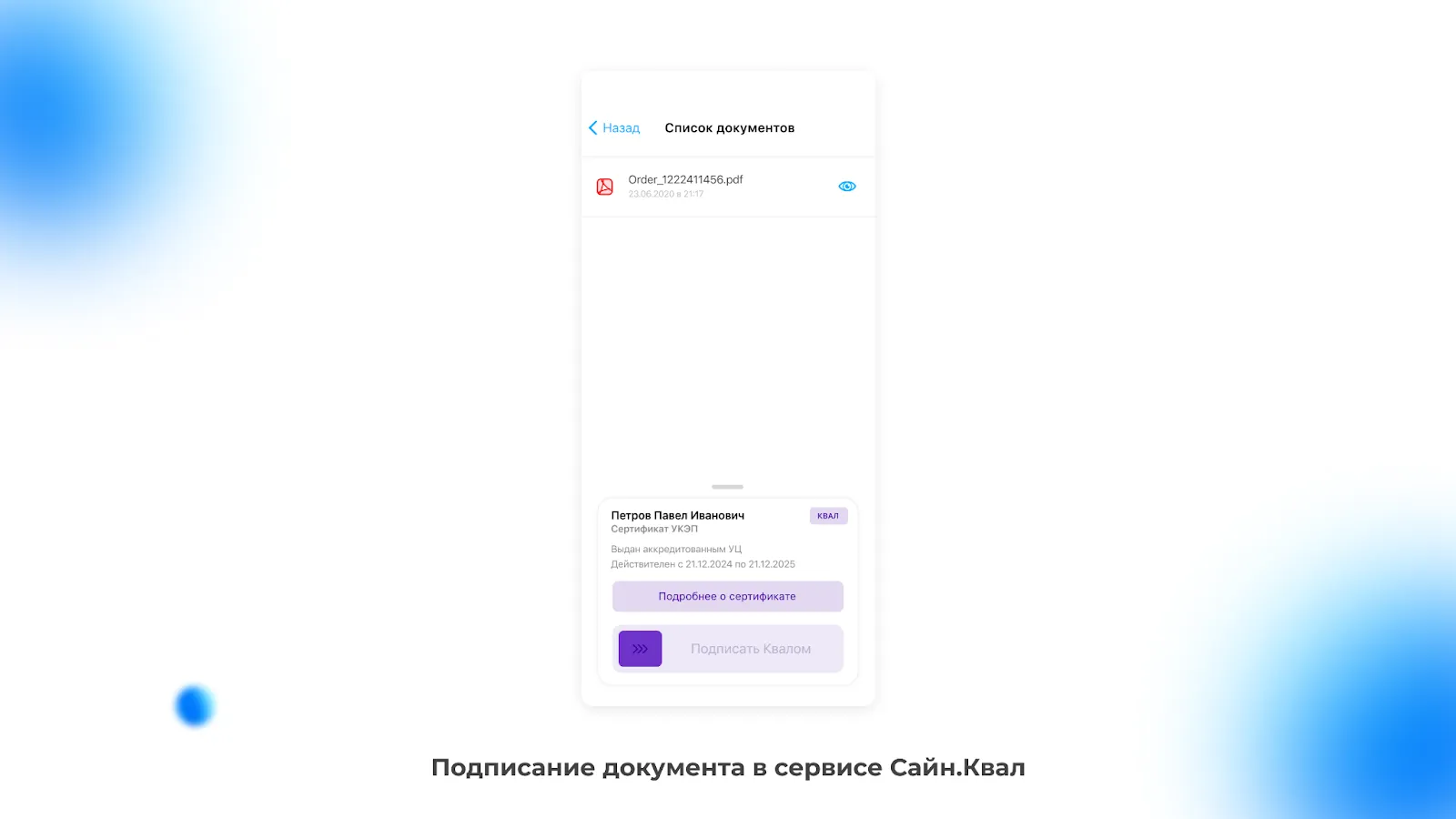 Сайн.Квал – сервис усиленной квалифицированной электронной подписи в мобильном приложении, сертифицированном ФСБ. Квал необходим, когда участникам документооборота нужно передавать документы в госорганы, например, при регистрации прав собственности на недвижимость в Росреестре.