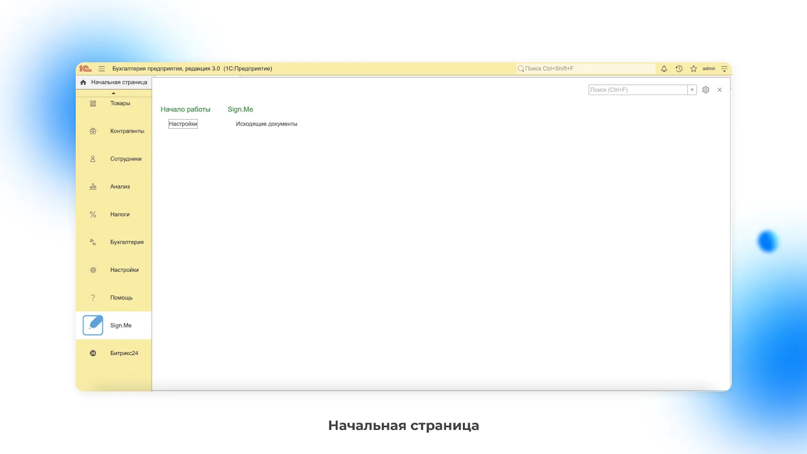 После загрузки 1С модуль Sign.Me будет доступен в левом нижнем углу интерфейса. Для начала работы перейдите в раздел «Исходящие документы».