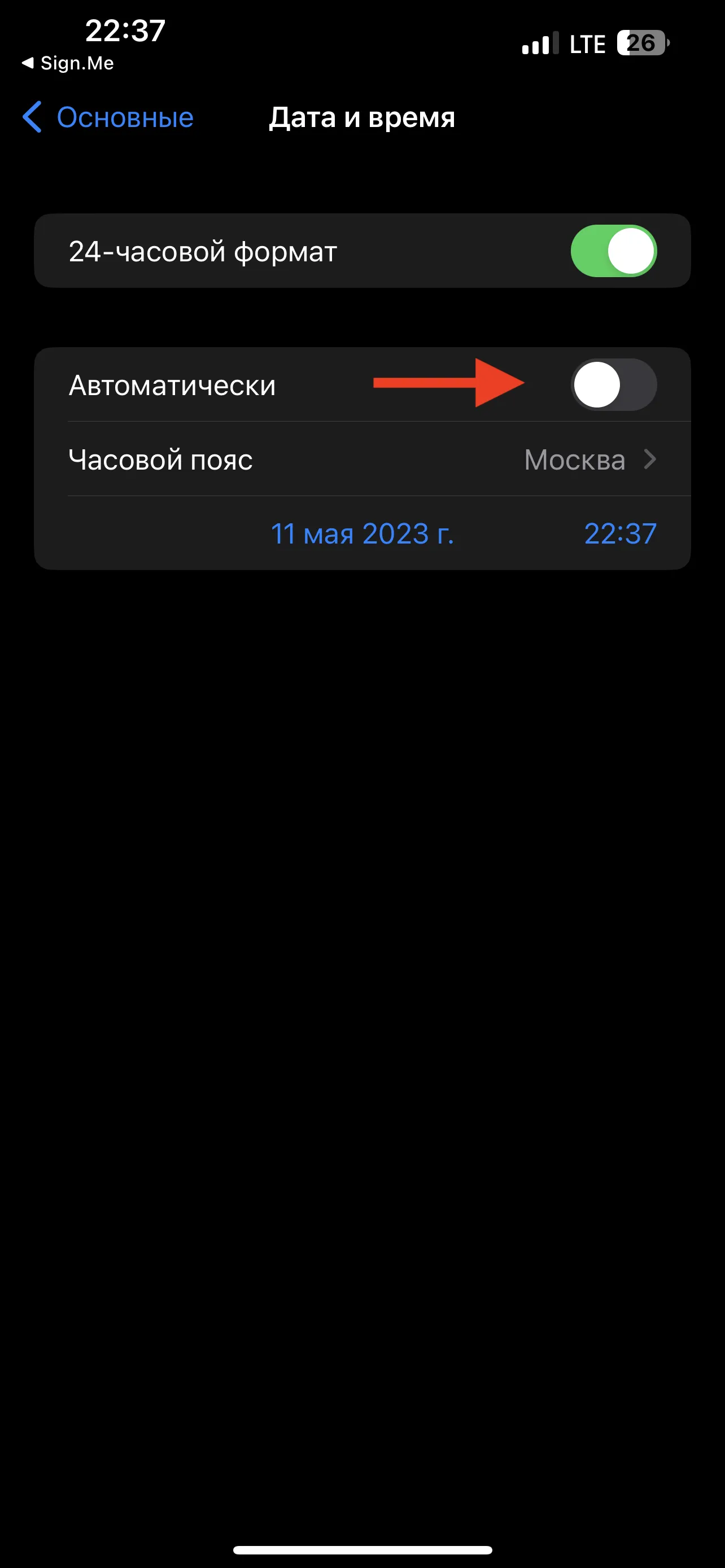 Если у вас открылся экран «На устройстве установлено неправильное время» – ваши дата и время, либо только время, указаны неверно. Для корректной работы процессов создания электронной подписи и контроля за сроками действия сертификатов, нашему мобильному приложению важно, чтобы дата и время соответствовали фактическим дате и времени по региону.