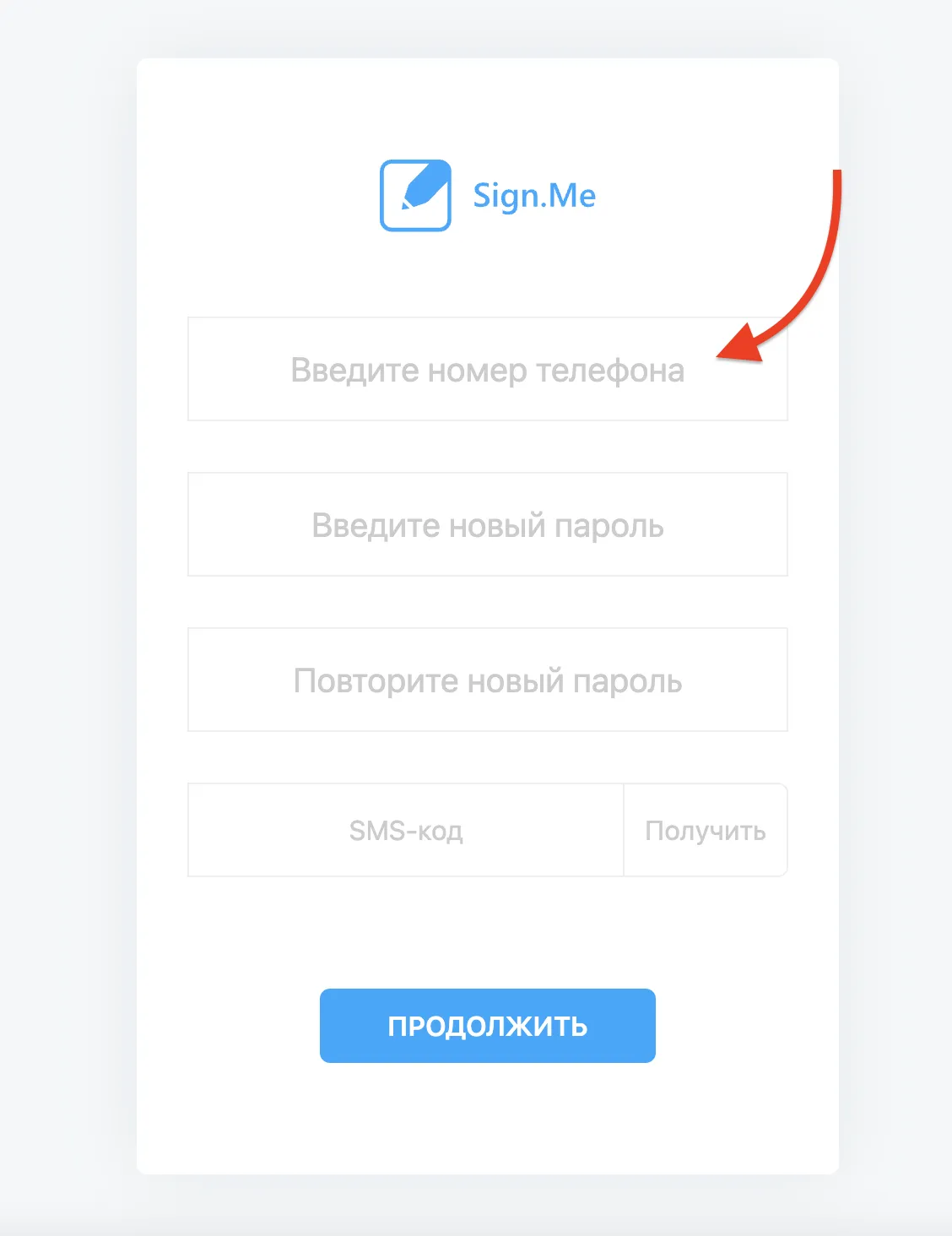 4. Введите номер телефона, указанный при регистрации в Sign.Me