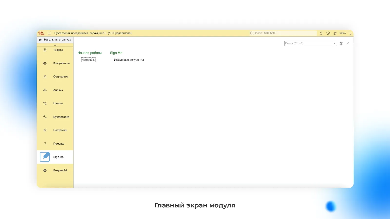 После загрузки 1С модуль Sign.Me будет доступен в левом нижнем углу интерфейса. Для начала работы перейдите в раздел «Исходящие документы».