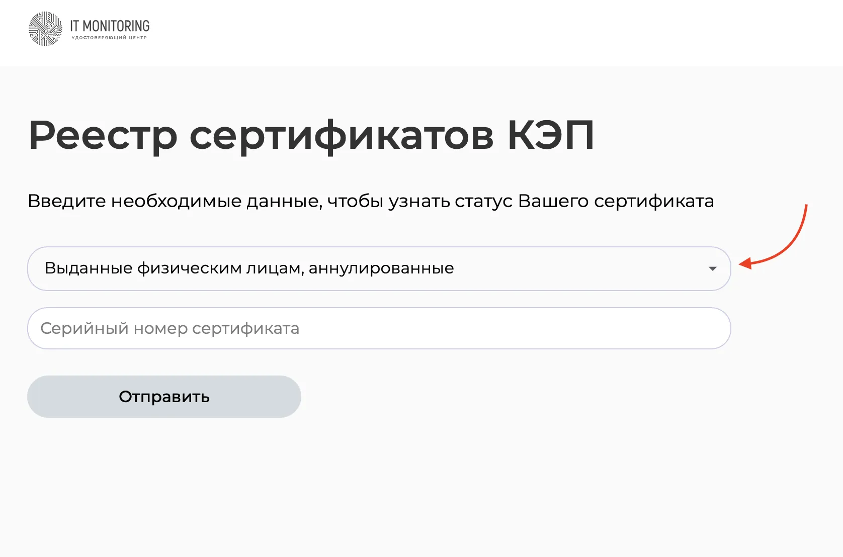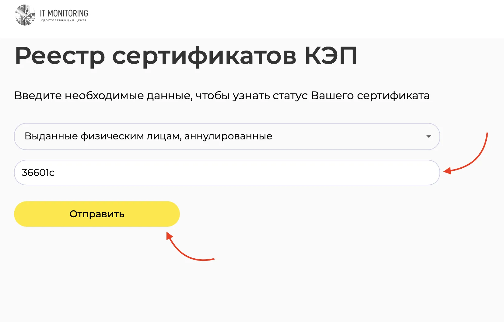 2. Введите серийный номер сертификата и нажмите "Отправить"