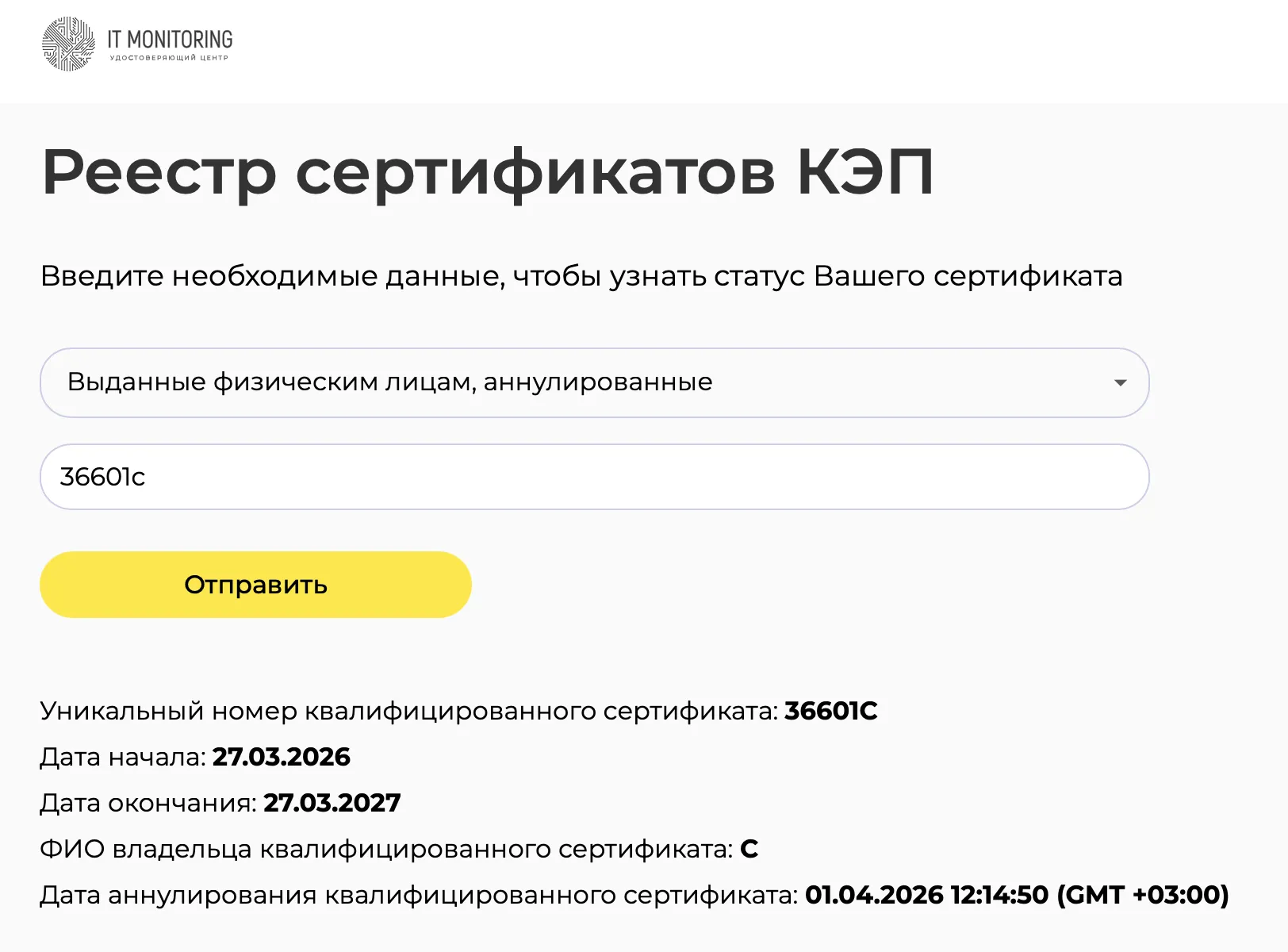 Проверка осуществляется по списку отзыва, а также в Реестре сертификатов КЭП УЦ АйТи Мониторинг