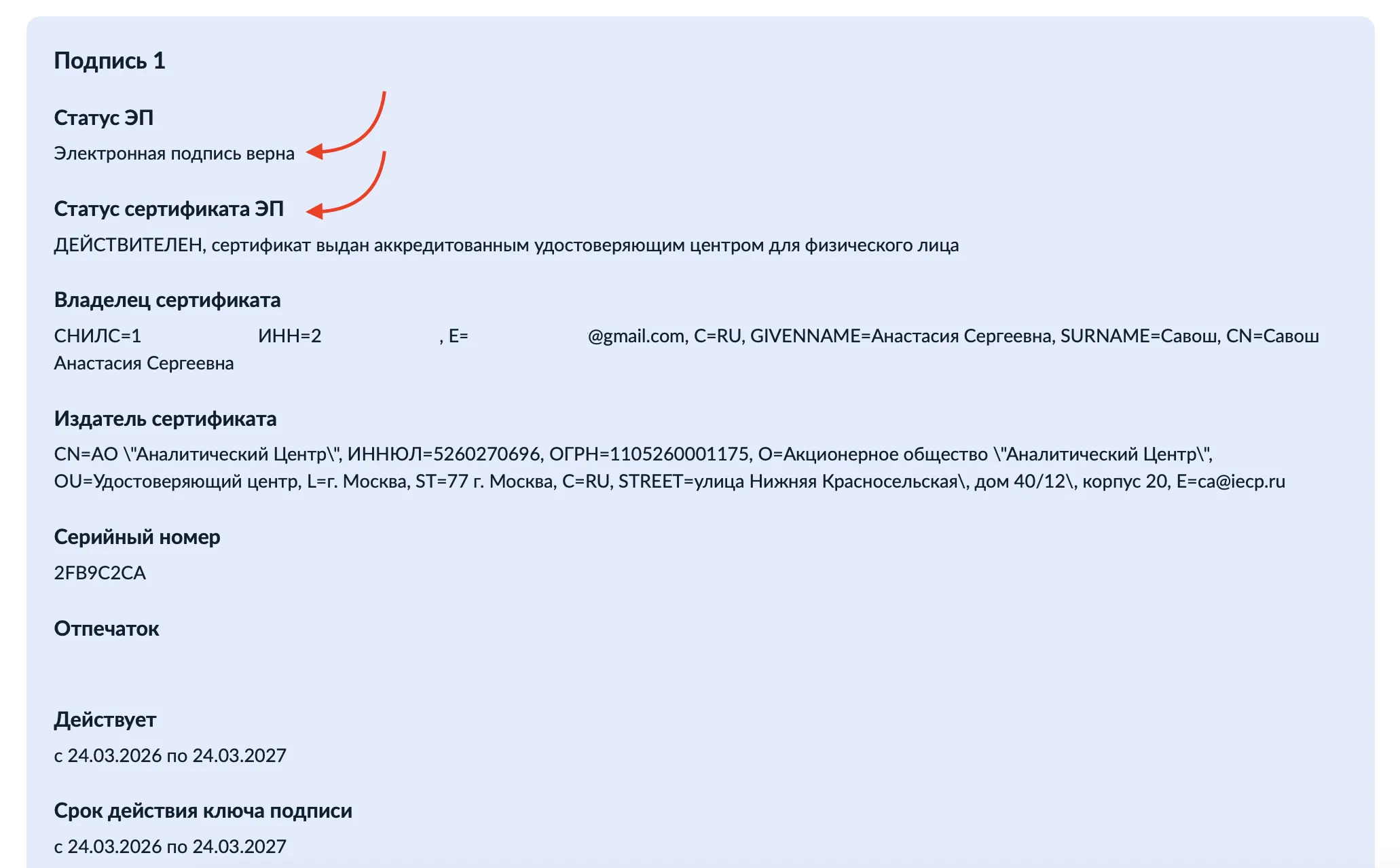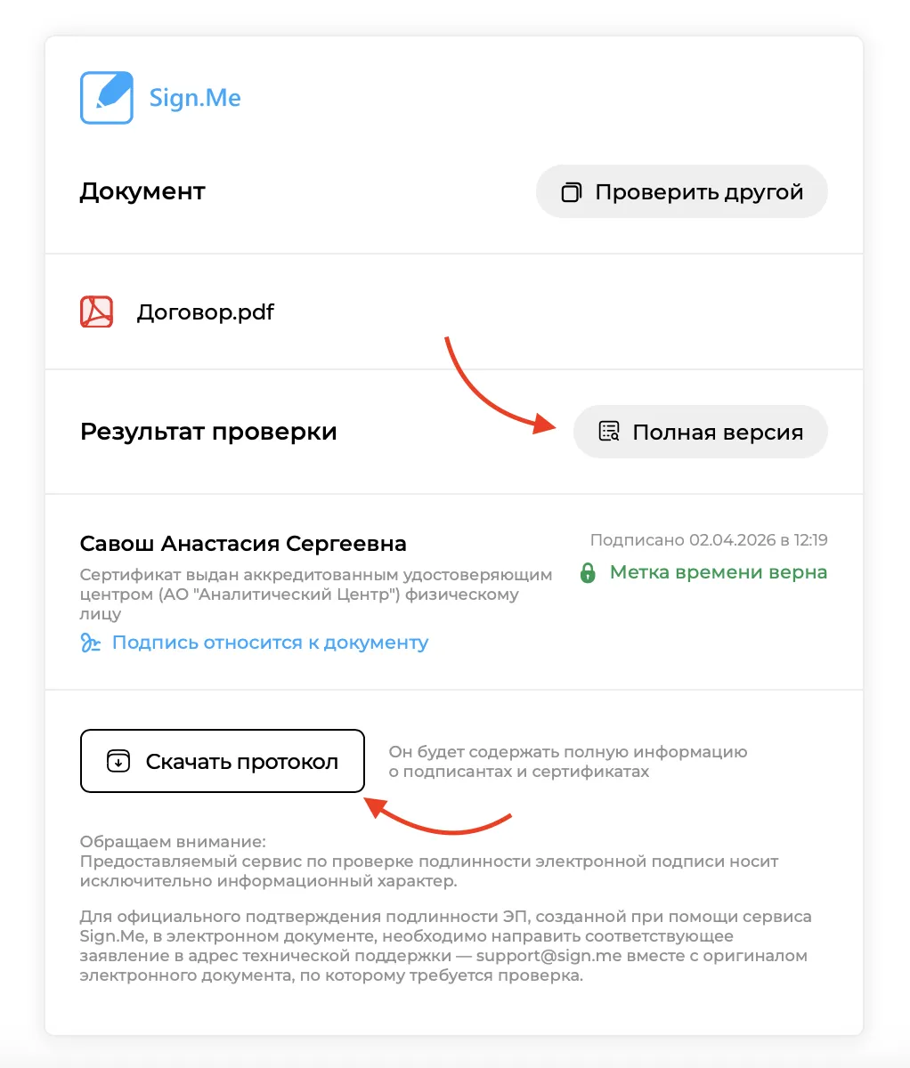 Вы также можете посмотреть полную версию проверки и скачать протокол для подтверждения подписания.