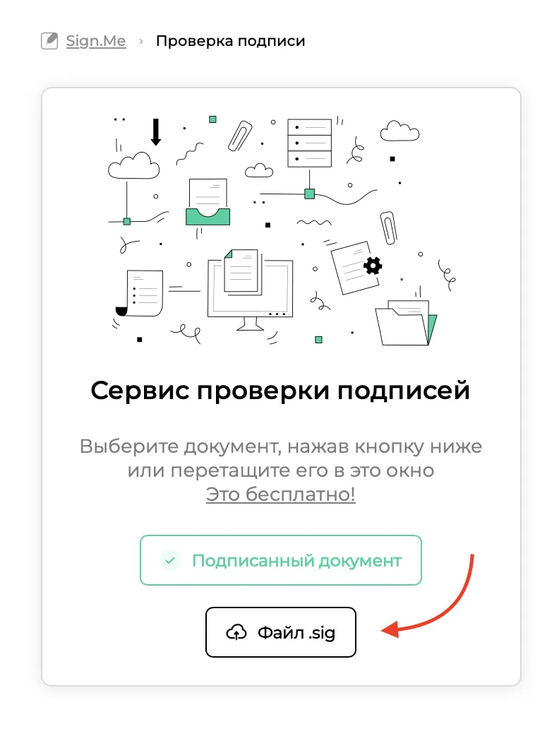 В это поле загружается файл подписи .sig, который вы скачали в мобильном приложении Sign.Me  или в Личном кабинете на сайте.